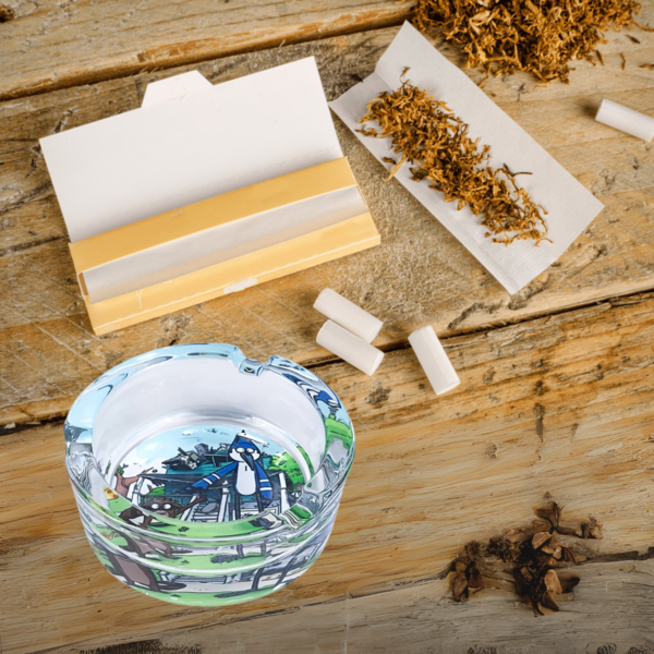 Smart waterproof sticker design placed underneath the glass ensures the artwork never gets damaged by heat or ash, maintaining its vibrant colours and crisp details through countless smoking sessions. The 8.5cm diameter provides ample space for multiple cigarettes or other smoking materials, whilst the 3.5cm height offers perfect stability and functionality.