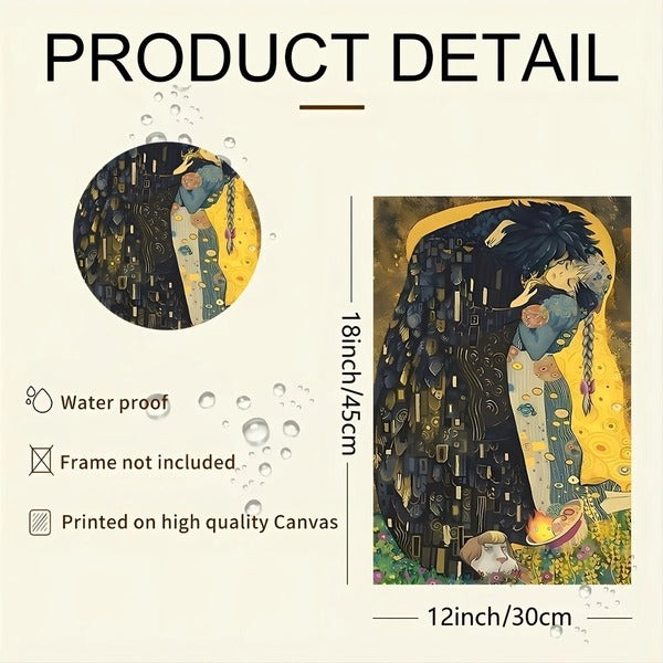 Features the enchanting embrace of Howl and Sophie surrounded by the geometric patterns and golden hues reminiscent of Klimt's famous work, complete with Calcifer and other beloved elements from the film woven seamlessly into the artistic composition. The 30.48cm x 45.72cm (12" x 18") size makes it perfect for creating a focal point in bedrooms, living rooms, or any space that needs a touch of romantic magic.